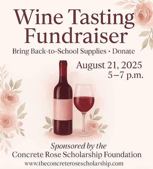 August 18, 2025: Help kids prepare for the start of school! Join us Aug. 21 for a back-to-school fundraiser for the Concrete Rose Scholarship Foundation — and enjoy a wine tasting party — at Slater’s Market in Alexandria, VA