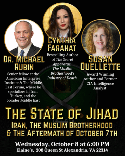 October 6, 2025: This Wednesday evening (Oct. 8, 6pm) at Elaine’s Literary Salon, learn about “The State of Jihad: Iran, The Muslim Brotherhood and the Aftermath of Oct. 7”