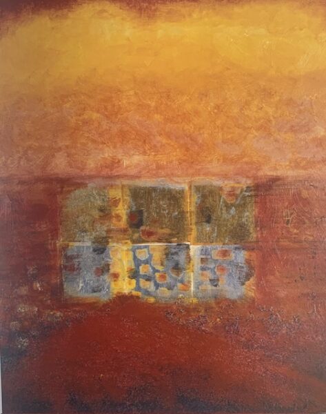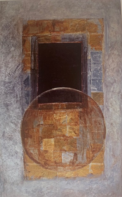 Using symbols, color, textural media and silver and gold leaf while guided by my intuition, I attempt to express an insight, a mood, a reflection about my own awareness of existence in an eternal landscape.