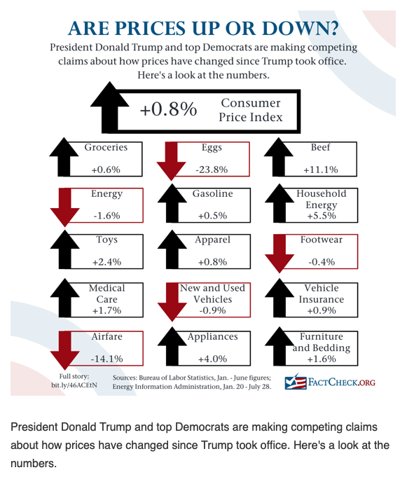 August 11, 2025: FactCheck.org helps us understand, “Are Prices Up or Down? Parsing Misleading Claims by Trump and Democrats”