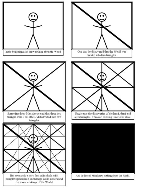 We leave you with this parting thought from Pete: “I believe that not looking at what is going on around us is a recipe for ignorance and catastrophe, but I also think that if you look too deep, the complexity will overwhelm you. For me it’s the hemi, demi and semi triangles that give you the clue to what is going on. That’s where I spend my time and I invite you to join me on my exploration of where they are and how they affect our lives.” Perhaps this cartoon (right) given to me by a particle physicist) expresses it best.Click here to Meet Pete, and learn more!